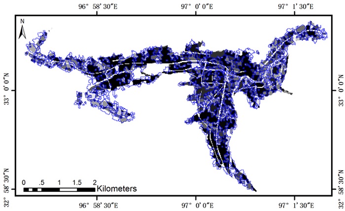 To verify the superiority of the proposed method compared with the gray features, we consider the original intensity image to detect the distribution of earthquake damaged building using the proposed method, in addition to the features involved in the gray features and no need for PCA. Images pre and post -earthquake are segmented by the watershed segmentation algorithm to generate segments. The difference method is used to calculate the difference images. The 94 samples are used to obtain the threshold value of the difference image ( Table 5). The distribution of the seismic damage is shown in Figure 11.