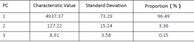 PCA is performed on the three texture features obtained and set to generate three components. Table 1 illustrates the statistics information of each PC. The first PC contains 96.49% of the feature information, accordingly, the first PC is chosen to participate in the analysis. The analysis of the first PC can be found, the four characteristic parameters of HOM, CON, DI and ME constitute most of the information of the first PC, accounting for 29.7%, 23.4%, 15.6%, 10.1% respectively. The rest of the texture are VA, ENT, ASM, COR, which account for a small proportion.
