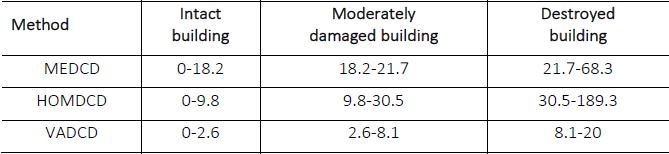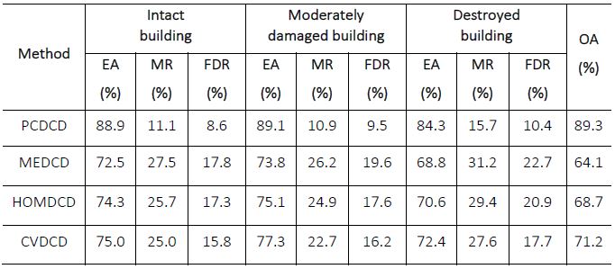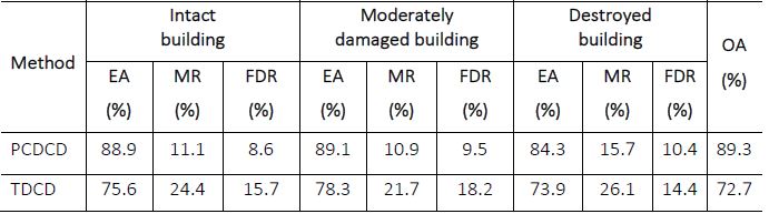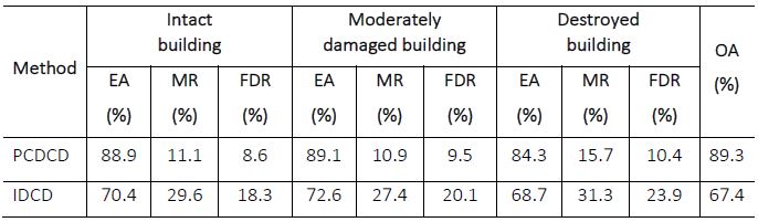 In the method of PCDCD, FDR of three types of earthquake damage building is 8.6%, 9.5%, and 10.4% respectively. The reasons for these errors are that the segmentation is not uniform, and the procedure is affected by the presence of roads that are not covered by mask.