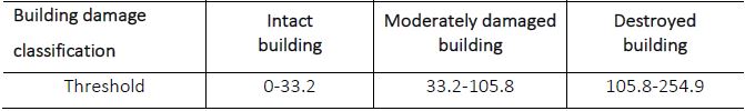 Ground investigation of building damage is conducted based on the classification in the Chinese Seismic Intensity Scale GB/ T17742-2008 (China earthquake Administration, 2008), buildings are classified into 5 categories in China which include (1) slight damage, (2) moderate damage, (3) substantial to heavy damage, (4) very heavy damage and (5) destruction. The evidence of the damage degree of buildings provided by remote sensing data is different from that of field surveys. Interpretation of earthquake damaged buildings is mainly based on the damage reflected at the tops of the buildings in remote sensing images.