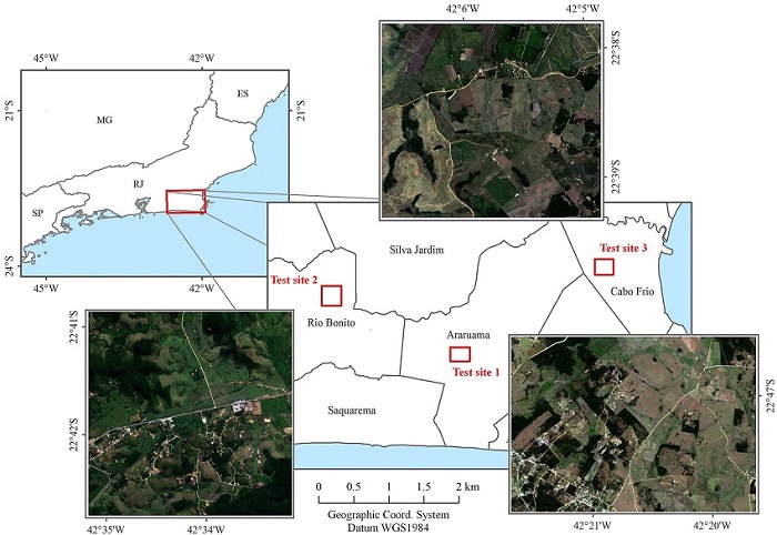 In current work, three sample sets of RapidEye images (level 3A) obtained from Geo Catalog of Brazilian Ministry of Environment (MMA) website, through the Civil Engineering Department of Federal University of Viçosa (UFV), were employed. The first and second sample sets covering the test sites 1 (Araruama) and 2 (Rio Bonito) were acquired on October 09th and April 06th 2014, respectively, and the third one from February 20th 2015 covers the test site 3 (Cabo Frio).