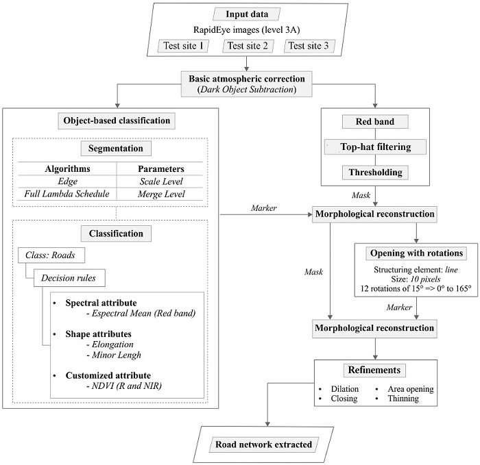 The method developed in this work for semi-automatic road network extraction from digital images is based on two major processes: object-based image classification and morphological operations. The proposed approach was tested on three RapidEye scenes and the aforementioned processes include several steps, which will be detailed in the following sections. The flowchart on Figure 2 summarizes the developed approach.