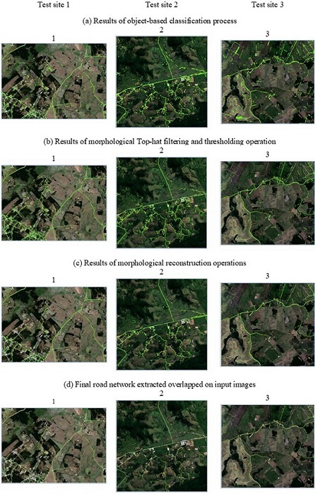 Regarding the evaluation road network extraction process, in terms of correctness and completeness measures, were obtained the values of 92.23% and 85.15% for test site 1, values of 79.16% and 81.06% for test site 2, and values of 82.05% and 92.22% for test site 3, respectively.