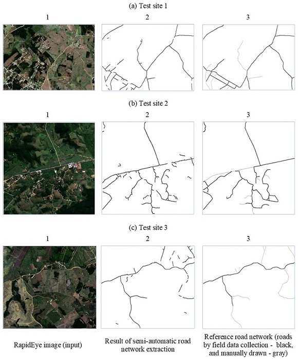 To perform the quality measures, the extracted road network ( Figure 4 a2, b2 and c2) was compared with roads from field data collection using GNSS (Global Navigation Satellite System) receiver, as reference data, that were provided by Teixeira (2016). In addition, some roads manually drawn by image interpretation were necessary to complete the road data collected in the field and to cover the entire road network presented in the images used, seen in Figure 4a3, b3 and c3. Then, the comparison was carried out, considering a tolerance area of one pixel size around either extracted and reference road network. The results of the evaluation are summarized in Table 2.