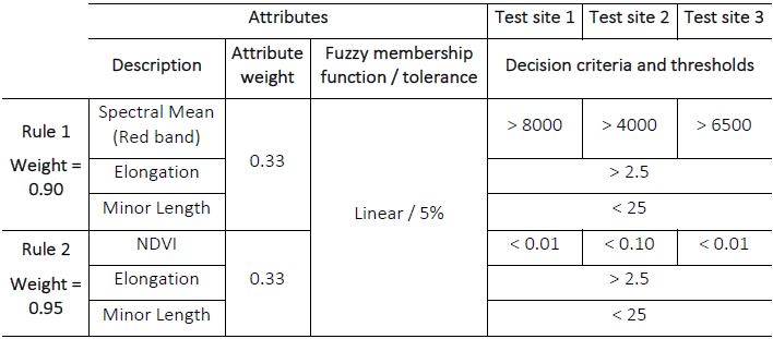 Therefore, from the defined rules, the objects are analyzed and classified or not in the class of interest (Roads) according to the conditions imposed by the decision rules. Although the rules developed preserve the same attributes, it was necessary adapted the thresholds values for some of these through analysis and manual selection on the attribute histogram, in order to fit the images of the test sites, as shown in Table 1.