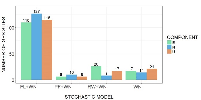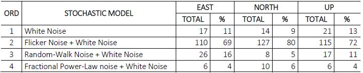 Figure 1 and Table 1 provide the distribution of the optimal noise models (based on BIC criteria) for the RBMC data. The results show that roughly 70% to 80% of the best noise models are a combination of flicker noise plus white noise. The combination of random-walk plus white noise characterizes between 5% and 16% of the time series and the remaining 5% of the time series are split between the classical white noise model and a fractional power-law noise process.