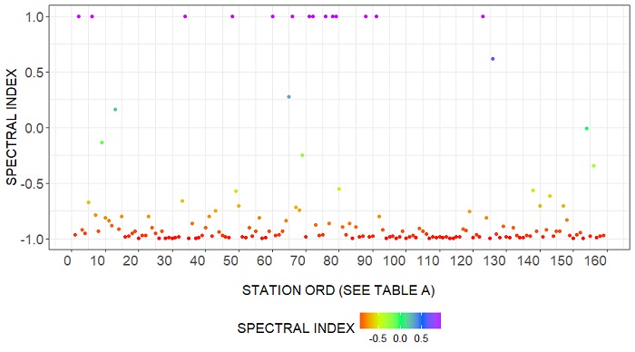 An important aspect to consider is that most of the existing studies only use a power-law noise process to calculate the stochastic model of the time series ( Bos et al., 2013; Williams, 2015; Klos et al., 2016; Klos, Bogusz and Moreaux, 2017). In this regard, if we apply a fractional power-law model to all RBMC time series, the spectral index k of the sites lies between -1 or 1 (fractional Gaussian noise) and, in most cases, this tends to be -1 ( Figure 2). Initially, this behaviour agrees with the results presented in Table 2 (Flicker nose with k = -1), however, the fractional power-law model is not able to detect the presence of random-walk noise in the time series and therefore, it has a limitation in the modelling compared to the approach used in this study.