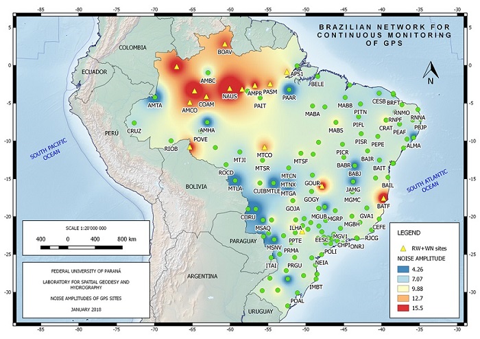 Currently, there are many different methods for assessing the noise content and their elements in time series ( Johnson and Agnew, 1995; Langbein and Johnson, 1997; Wdowinski et al., 1997 ; Zhang et al., 1997 ; Mao et al., 1999 ), however, the most robust is the Maximum Likelihood Estimator (MLE) ( Bos et al., 2008 , 2013; Williams, 2008). It estimates the noise components and the other parameters of the stochastic model, finding the set of values of the model that maximize their likelihood function ( Langbein and Johnson, 1997). In general, the MLE can be found the set of values as an explicit function of the observed data, or through global numerical optimization ( Bos et al., 2008 , 2013). Based on the aforementioned, and because currently there are no studies related to the analysis and calculation of the noise sources in GPS time series in Brazil, this study seeks to establish the basis for the description of GPS time series uncertainties at the national level. In this regard, this paper focuses on the analysis of the stochastic properties of the time series of weekly position estimates for 159 sites of the Brazilian Network for Continuous Monitoring of GPS using the modified MLE algorithm established by Bos et al., ( 2013). Finally, we examined 4 different possible stochastic models. They are a classic white noise (WN), a flicker plus white noise (FL+WN), a random-walk plus white noise RW+WN) and a fractional power-law noise model.