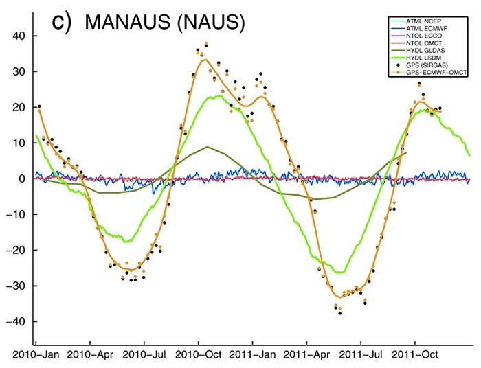 As can be seen from the Figure 3, it is evident that most GPS sites, whose stochastic model is an RW + WN process, coincide with sites located in coastal zones and river basins. Initially, it may imply that the behaviour of the data of these stations is aliased by the prevalence of different physical signals typical of this type of zones, such as the hydrological, non-tidal oceanic loading or atmospheric pressure loading. A particular example of a GPS site whose motion is aliased by external physical effects is the NAUS station, whose vertical displacements can vary around 7 cm (variance of seasonal signal) ( Figure 4).
