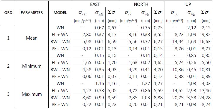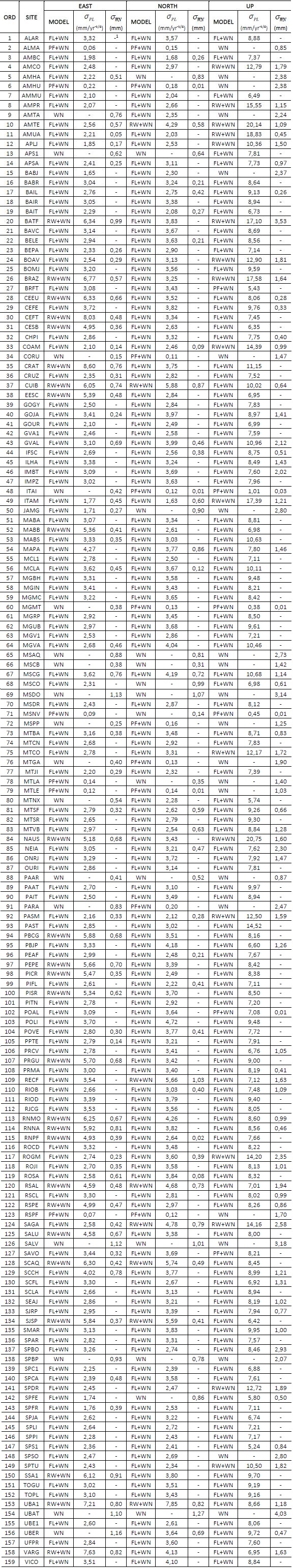 A summary of the noise magnitudes for each solution is provided in Table 2. In principle, it is possible to see that the stochastic model with the lowest magnitudes of noise is the fractional power-law plus white noise model (PF + WN), whose accumulated noise variances (Σσ = σ PL+ σ WN) are in order of 0,15 mm for the horizontal components and 3 mm for the vertical component. (The symbol “-” indicates that the estimation made did not obtain a noise value for the specified model). It is important to note, the fact that the mean variance of the white noise in this model is almost zero and therefore, it does not represent even one percent of the total accumulated noise value. The next models are the classical white noise model with accumulated noise variance in order of 0,7 mm for horizontal components and 2 mm for vertical component, the Flicker noise plus white noise, with accumulated noise variances of 3 mm for horizontal components and 10 mm for the vertical component and the Random-walk plus white noise with accumulated noise variances in order of 6 mm for horizontal components and 15 mm for vertical component. An interesting detail to emphasize is the growing tendency of the accumulated noise variances between combined models (white noise plus power-law noise) (i.e. the noise grows by a factor of 3). For instance, the variance of PF + WN model is 3 times lower than the variance of FW + WN model, and this is 3 times lower than the variance of RW + WN. The same applies to the components of the sites. In this case, the horizontal components are also less noisy than the vertical component by a factor of 3, which coincides with results obtained in other studies ( Zhang et al., 1997 ; Mao et al., 1999 ; Langbein, 2004)