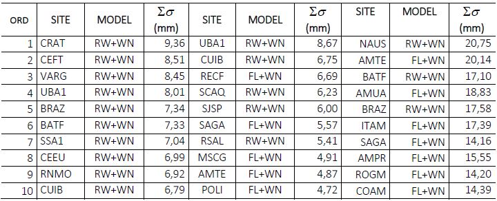 It is interesting to see that in the present research, the Manaus station is precisely the station with the highest level of noise. It suggests that the claim that the high variances of RW + WN processes are produced by the motion of the site is correct, however, there is not enough evidence to ensure this. Finally, a detailed description of the variances of the noises for each station is presented in appendix 5.1.
