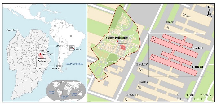 The area studied consists of Blocks II and III of the Centro Politécnico located at Campus III of the Federal University of Paraná, in Curitiba-PR, Brazil. There is a large amount of information associated with these buildings, such as: classrooms, teaching laboratories, communal socialization areas, commercial establishments, department/sector rooms, employees’ rooms and bathrooms. The structural complexity of the two-storey building makes user orientation within it difficult ( Figure 1).