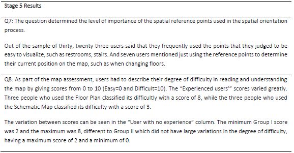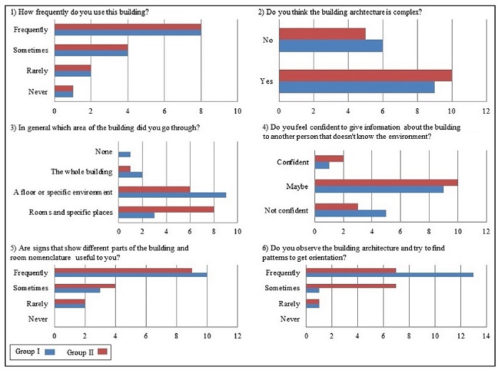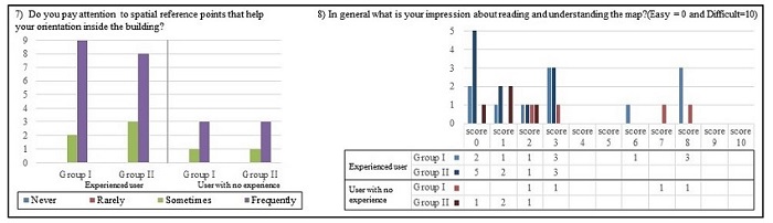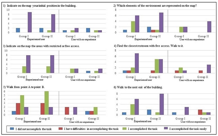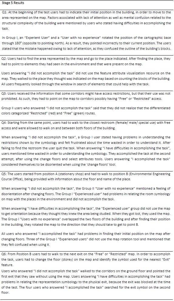 Stage 5 focused on user positioning and orientation tasks based on the maps. The questions approached the user’s internal route and were related to the use of the symbology adopted in the representation, and the usefulness of orientation signs displayed in the buildings (identification signs found in the environment). The users were asked to perform the task “Point” (identify the represented element in the physical environment and point to its location; and to find specific rooms and points based on maps (walk to the required place). Groups I and II were divided according to their prior knowledge about the building structure, i.e. users familiar or not familiar with walking in the buildings, “Experienced user” and “User with no experience”. Figures 11 and 12 present the questionnaire questions along with the answers obtained. Tables 4 and 5 provide considerations regarding the questions and comments made by the users (Stage 5).