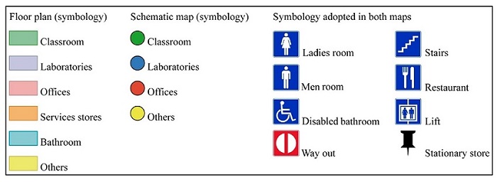 The attributes of the features include their nomenclature and main characteristics. The rooms contain information related to their intended use (e.g. classrooms, offices and laboratories); the corridors show accessibility information (free or restricted access); the bathrooms are classified according to gender (female or male) or users with special needs. The symbology adopted in the representation of the possible POI is equivalent on the maps.