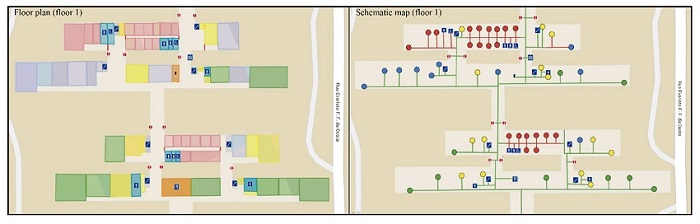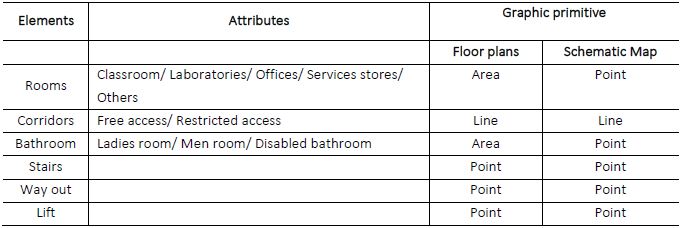 During data collection Points of Interest (POI) were defined. They were represented according to the Floor Plan and Schematic Map specifications. Table 1 shows the difference between the graphic primitives used in each map to represent the same feature.