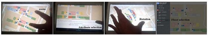 The MyMaps application tools enable different map scales to be seen (zoom), GPS activation to estimate local position, the possibility of map rotation in keeping with the user’s current position in the environment, the exhibition of feature attributes, and the option to exhibit only features identified in specific environments of the building (objects on a given floor of the building) ( Figure 4).