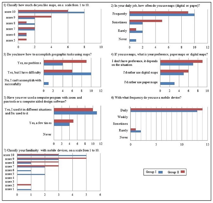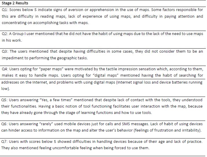 Stage 2 established the level of user familiarity with mobile devices and maps in general. Figure 8 presents the questionnaire questions and the answers obtained. Table 1 provides considerations regarding the questions and comments made by users (Stage 2).