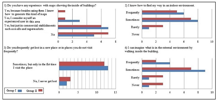 The users taking part in the tests were divided in two groups: Group I evaluated the Floor Plan; Group II evaluated the Schematic Plan. Both groups had users who were used to walking inside the building, as well as users who were not familiar with the environment.