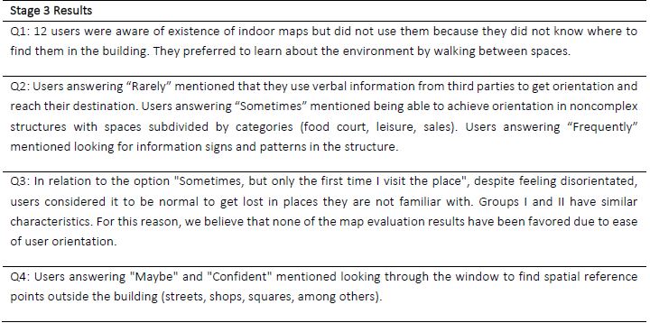In Stage 3 we sought to determine the user’s experience of using indoor maps and the importance of this type of map for the user. Figure 9 shows the questionnaire questions along with the answers given. Table 2 provides considerations regarding the questions and comments made by users (Stage 3).