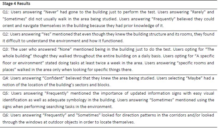 During the tests user audio recordings were made to allow verification of the veracity of the observations noted by the interviewer about difficulties described by users as they performed the task (think-aloud). This method allows problems found to be assessed and time spent performing the tasks to be measured. Based on the answers obtained, some user strategies for POI identification in the indoor environment were revealed.