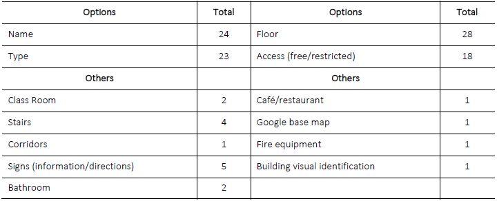 Out of the total sample, 9 Group I users and 3 Group II users needed to ask to the interviewer how the types of rooms were classified and their respective colors on the representation. The “Other” category confused the users because it covered various types of room use (administration offices, storerooms). Seven users mentioned that the elements comprising this category should be represented by specific symbology related to the type of room use.