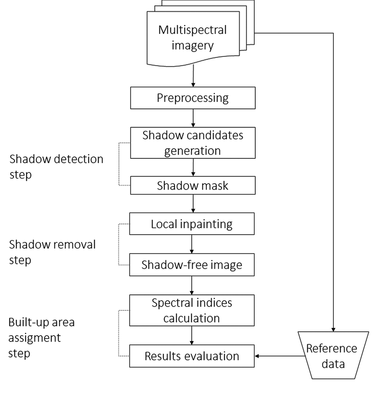 The proposed methodology for extracting built-up areas comprises four basic steps: 1) Data Preprocessing, 2) Shadow Detection, 3) Shadow Removal and, 4) Built-up Area Assignment. The current methodology is detailed in Figure 1.