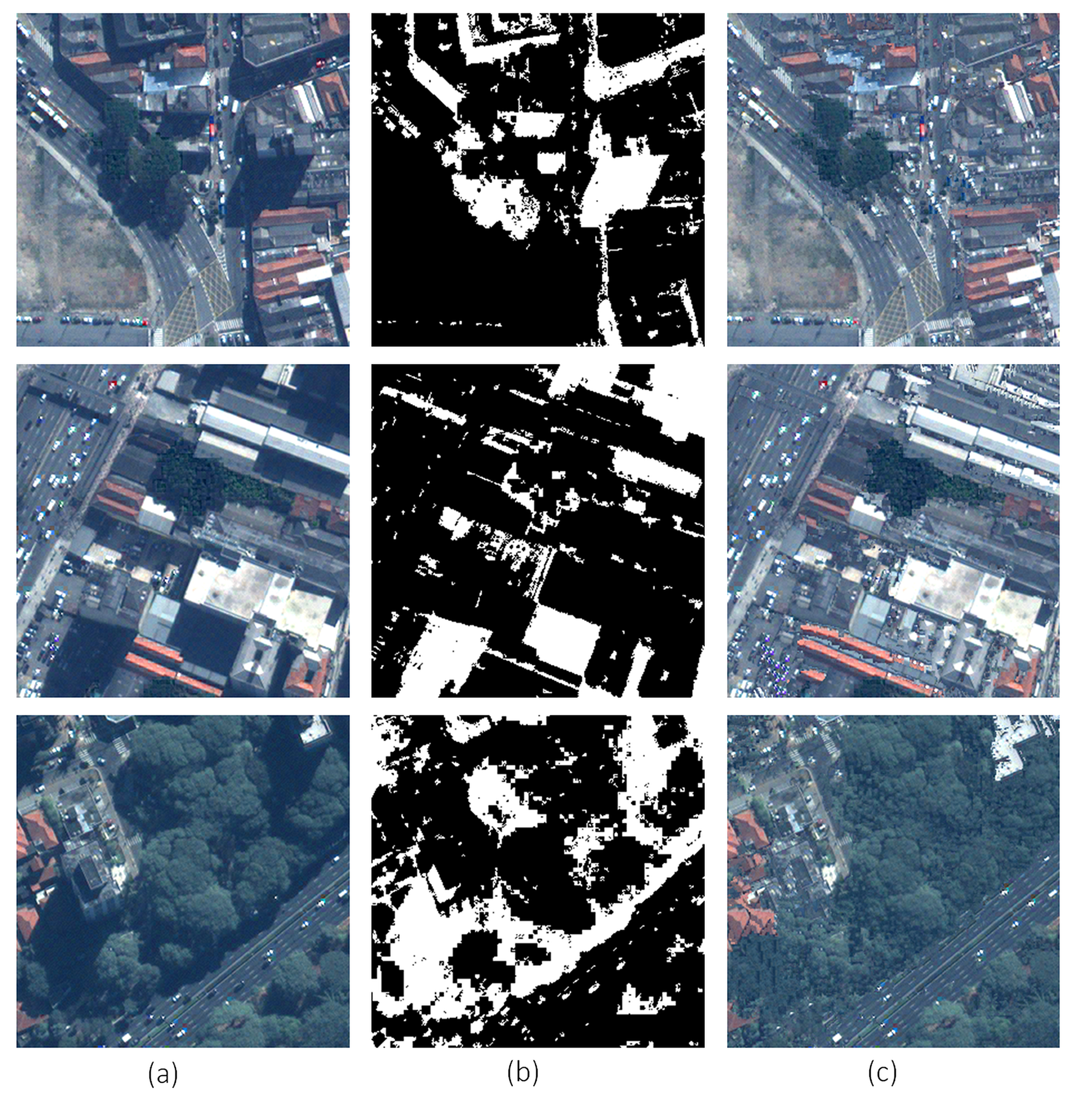 Shadows are formed when sunlight is blocked by tall objects present at the scene, causing partial or even total loss of spectral information from the Earth surface covered by shadows. This effect can interfere in the acquisition of reliable data such as road network ( Li et al., 2016), buildings ( Ok, 2013), and vehicles ( Asaidi et al., 2014). Therefore, removing shadows from RS images has been an important task for real-world applications, being essential as a preprocessing step for multisource data such as video sequence ( Sanin et al., 2012, Al-najdawi et al., 2012), aerial ( Adeline et al., 2013), and satellite images ( Dare, 2005, Song et al., 2015). Diverse attempts have been made in the RS literature towards dealing separately with the shadow detection and removal in VHR images ( Chung et al., 2009, Liasis and Stavrou, 2016, Tian et al., 2016, Sasi and Govindan, 2016). However, due to the complexity of both problems offers for existing techniques, processing highly heterogeneous urban areas carrying distinct image elements has been a challenging and labor-intensive task, especially when one intends to both detect and recover the patterns damaged by the shadows. Moreover, misclassification and false detection due to the presence of dark materials are other common issues recurrently faced by existing shadow detection methods, as stated by Adeline et al. ( 2013).