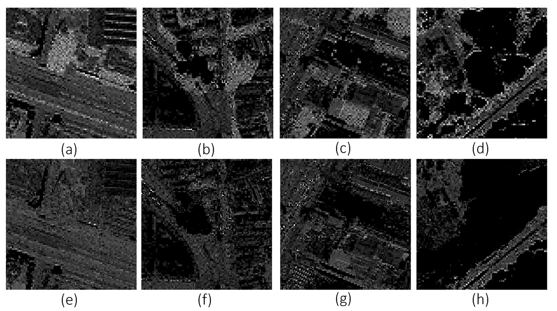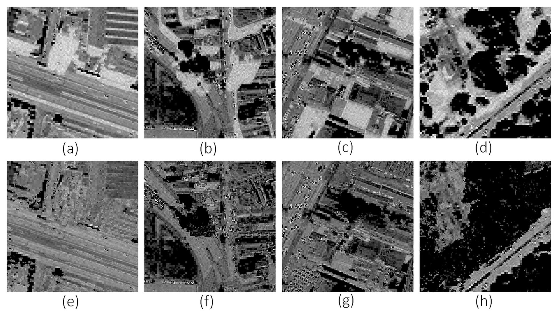 Two spectral built-up indices were applied to assess the improvements provided by our shadow mitigation module (the inpainting process) in urban areas. The indices VgNIR-BI and VrNIR-BI were computed for the original pansharpened WV2 and shadow-free images, and then shown in Figure 6 and Figure 7, respectively. Recall that both indices comprise the visible red and green channels, respectively, in conjunction with the NIR channel.