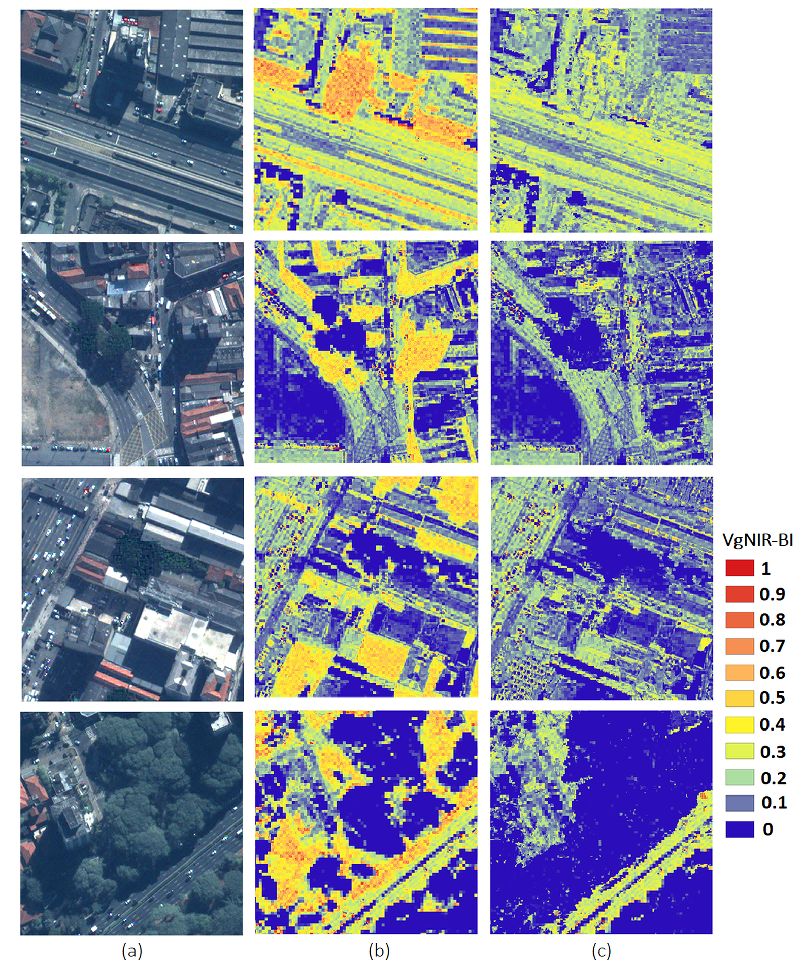 The increase in warm color indicates that the density of built-up land in the analyzed area is higher. There is a significant change in the VgNIR-BI results before and after shadow removal, since yellow areas highly saturated by the shadow presence was reduced and turned into pixels more similar to their surroundings, as observed from the results. Thus, built-up areas detected after shadow removal gave values ranging in [0.2,0.5] (expect outliers). Despite some artifacts were generated after the inpainting process, the proposed framework is proven to be effective for the task of shadow elimination as, for instance, observed from the roads network correctly detected by VgNIR-BI.