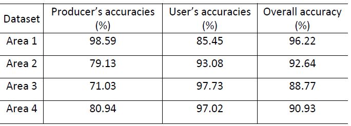 Quantitative evaluations were also performed by comparing the binary output against a reference image (ground truth (GT) image as manually generated by human annotation). From the GT image and the obtained shadow binaries, the values for producer's accuracy, user's accuracy and the overall accuracy (see Adeline et al., 2013 for details) were computed for each area tested, as listed in Table 1.