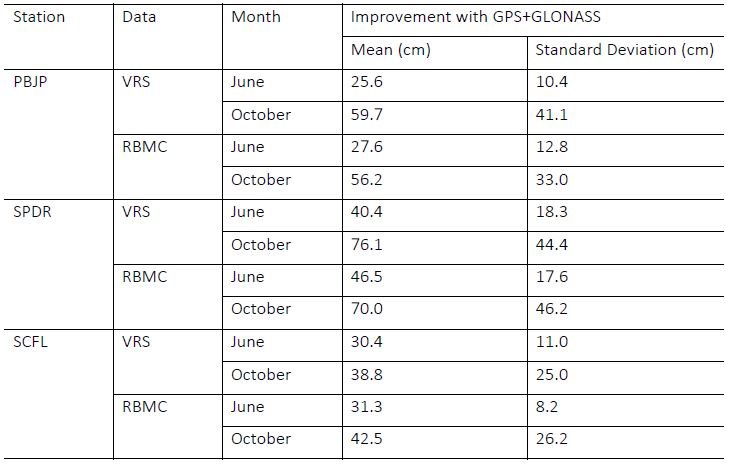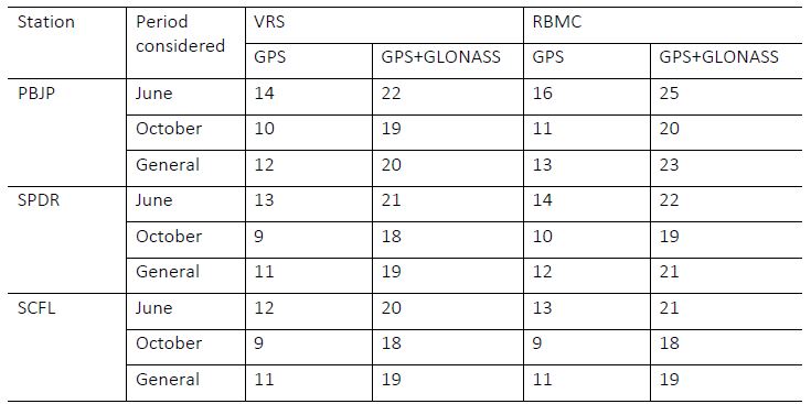 Apart from the MSE differences noted from one month to the other, the mean percentages of improvement with the GLONASS data added to the GPS was also similar for both months. In June, the mean improvement by using GPS/GLONASS data was 49.0%, and in October, 48.6% considering the three stations and results from real and virtual data. In the same way, considering real and virtual data, the mean percentages of improvement were compatible. For PBJP station the mean improvement by using GPS/GLONASS data was about 45%, for SPDR station, 52% and for SCFL station, about 49%.