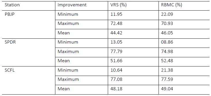 Table 4 presents minimum, maximum and mean percentages of improvement by using GPS/GLONASS combined data for real and virtual data, considering each station. The smaller percentage improvement value, after adding GLONASS data, was for SPDR station using real data, with 9% improvement. The biggest occurred at the same station with virtual data (77.79% improvement).