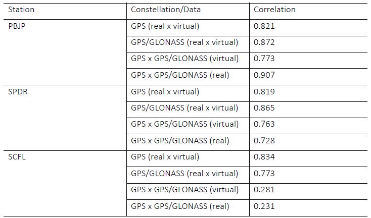Table 5 presents the Pearson’s correlation coefficients between virtual and real data, considering GPS and GPS/GLONASS data. In a general way, real and virtual data presented high correlation values, with values of about 0.8.