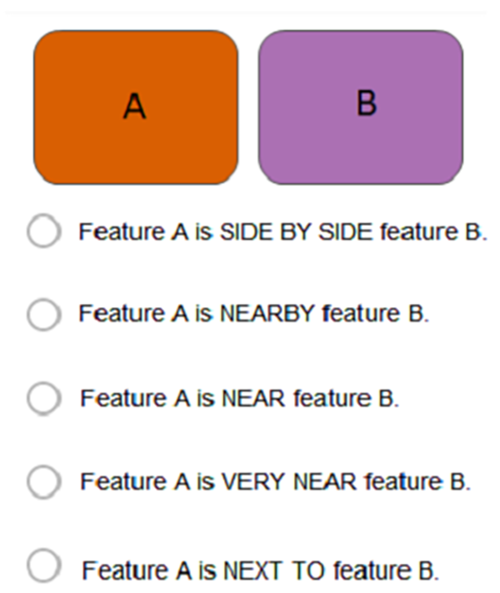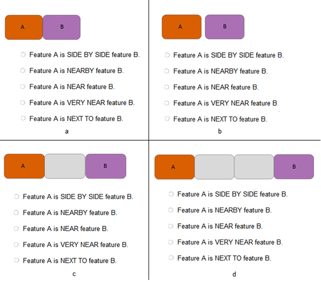 Figure 3 presents the scenarios presented for the users. The four spatial configurations, presented in Figure 3, were spatially characterized using the same spatial descriptions: “Feature A is side by side feature B”, “Feature A is near feature B”, “Feature A is very near feature B”, “Feature A is next to feature B, “Feature A is nearby feature B”. The locative expressions were the same for the four scenarios presented in Figure 3, and the experiment was designed in a way that allowed users to choose only one locative expression per scenario. In addition, users had the possibility to return to the scenario already answered, review their answers and modify them, if they thought necessary. It is important to point out that the users visualized only one scene at a time and that the elaborated spatial configurations intended to convey to the user an increase in distance between features A and B insofar as new elements in the composition of the scenarios are introduced.