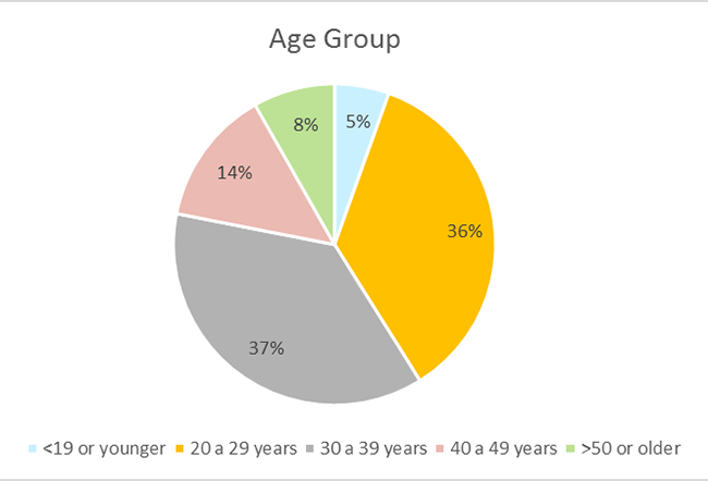 The experiment obtained a sample of 73 responses during the period that was available to users. Regarding the age group, it was not possible to make observations confronting the spatial relations chosen with the age of the users. This was due to uneven sampling, since the experiment obtained 26 and 27 users in the age groups of 20 to 29 years and 30 to 39 years, respectively. Whereas only 4, 10, and 6 users were stratified at age 19 or younger, ages 40-49 and older than 50, in that order. Figure 4 shows the percentages obtained from participants for each age group.