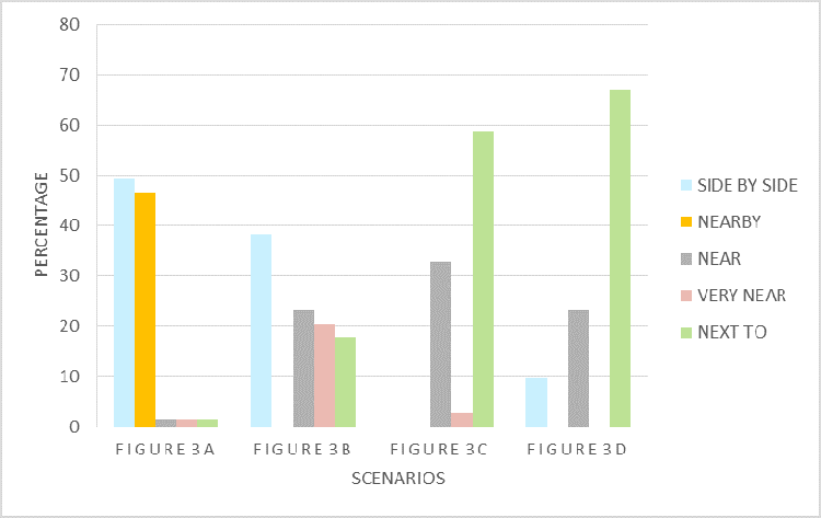 For the spatial configuration presented by the schematic drawing of Figure 3a, all the spatial relations of this experiment, “side by side”, “near”, “very near”, “next to”, “nearby”. Despite this, attention should be paid to the fact that the spatial relations “side by side” and “nearby” covered 95.6% of the users” choices, being 46.6% for “nearby” and 49.3% for “side by side”.