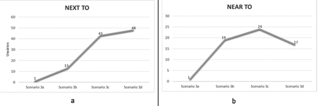 From the figure above, it was noticed that the use of the spatial relation "next to" increases as the distance between elements A and B increases. The same happens with the spatial relationship "near to", although there was a significant drop in its use when scenario changes from 3c to 3d. Confronting this result with the work of Freundschuh and Blades (2012), in which the authors have conducted experiments to evaluate the development of the spatial concept of spatial relations “near” and “next to” (equivalent in Portuguese of “perto” and “próximo”) from childhood to adulthood, it was noticed the incompatibility of the conclusions in the relations mentioned, although in different language. These authors concluded that with increasing age, to represent smaller distances between objects, the users used the spatial relation “next to”. In other words, when users had to locate certain objects using the “next to” spatial relation, the distance between these objects was smaller than when using the “near” spatial relation.