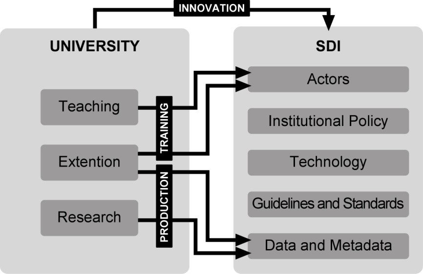 Teaching and Extension activities enable and sensitize its actors, whether they are creators, users, producers or providers of spatial data. Research and Extension activities produce data and metadata that can feed a SDI. In addition, the University is an environment that favors experiments that lead to innovations, advances and adaptations in all aspects related to SDIs, from institutional policy to the definition of norms and standards (Brito et al. 2014).