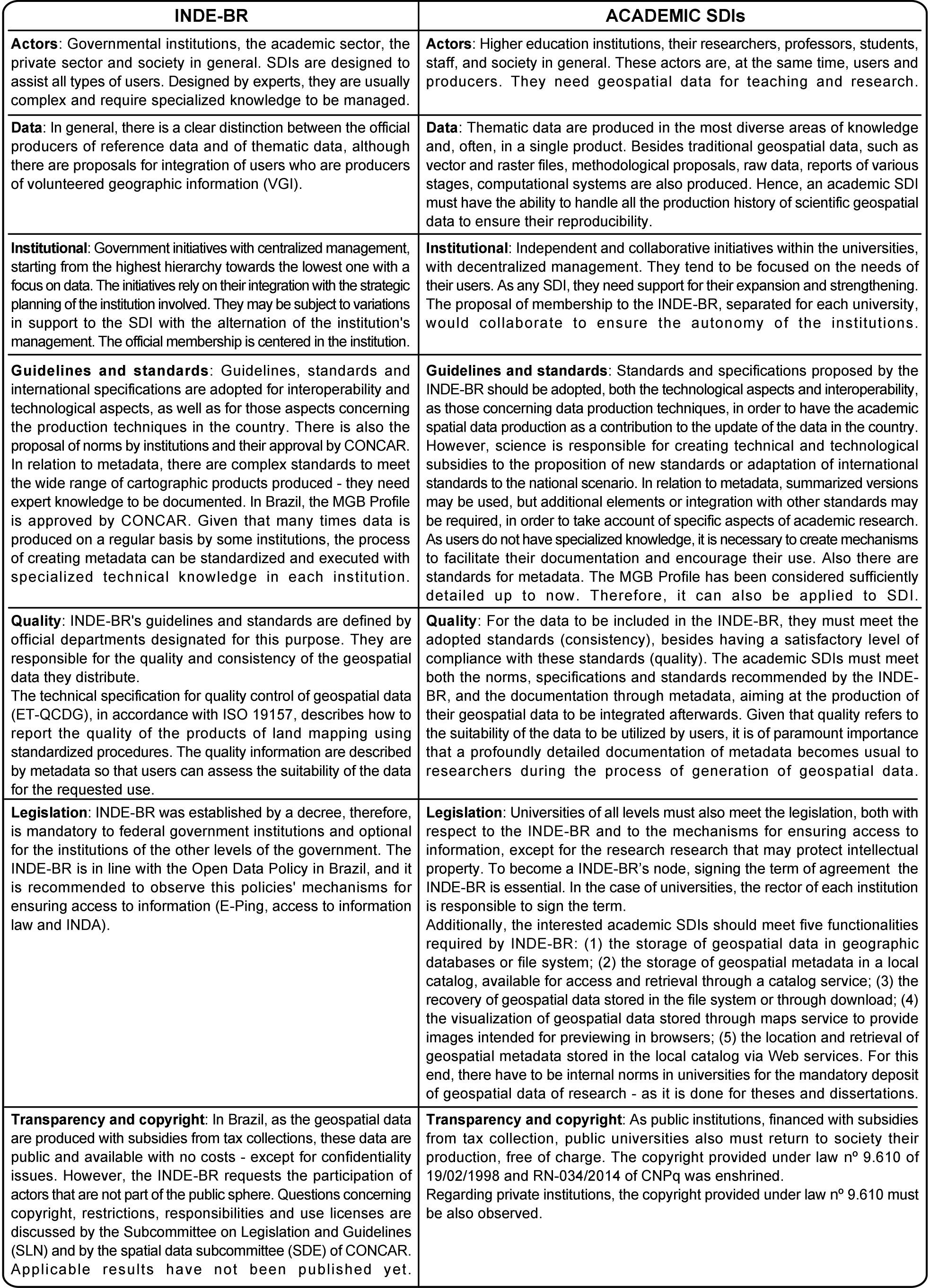 According to (Coetzee et al. 2017), the purpose of the academic SDI is "to make geospatial data produced for and by research and education discoverable, accessible and usable, primarily within universities and research institutes, but sometimes also for a wider audience, such as the general public". However, this definition can be adapted according to specific legislation and guidelines of each country. Figure 2 summarizes the reflections made during the execution of the research as a whole, in order to help define the characteristics of academic SDIs in Brazil in comparison to general aspects of INDE-BR. The analyzed aspects were the five pillars of an SDI: actors, data, institutional, technologies, and norms and standards. Apart from these, legislation, transparency and copyright, and quality were also analyzed.