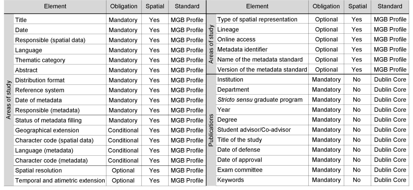 The metadata survey of the areas of study was performed based on the Brazilian Geospatial Metadata Profile (MGB Profile) in its summarized version. All 23 elements were used, including the mandatory, conditional, and optional ones. The Figure 3 shows these elements and additionally the Dublin Core standard elements used for the publications.