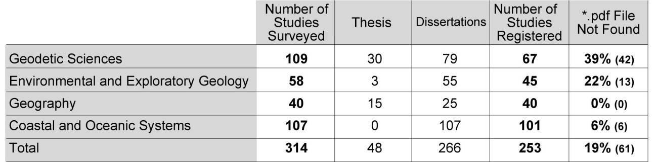 An analysis of the proportional amount of publications in each program revealed that the Geodetic Sciences program obtained the highest percentage of pdf documents of the publications which were not found (39%), followed by the Environmental and Exploratory Geology program (22%) and the Coastal and Oceanic Systems program (6%). Although the Geography course did not present any missing files among the analysed publications, it does not have an organized listing and publications available on its website.