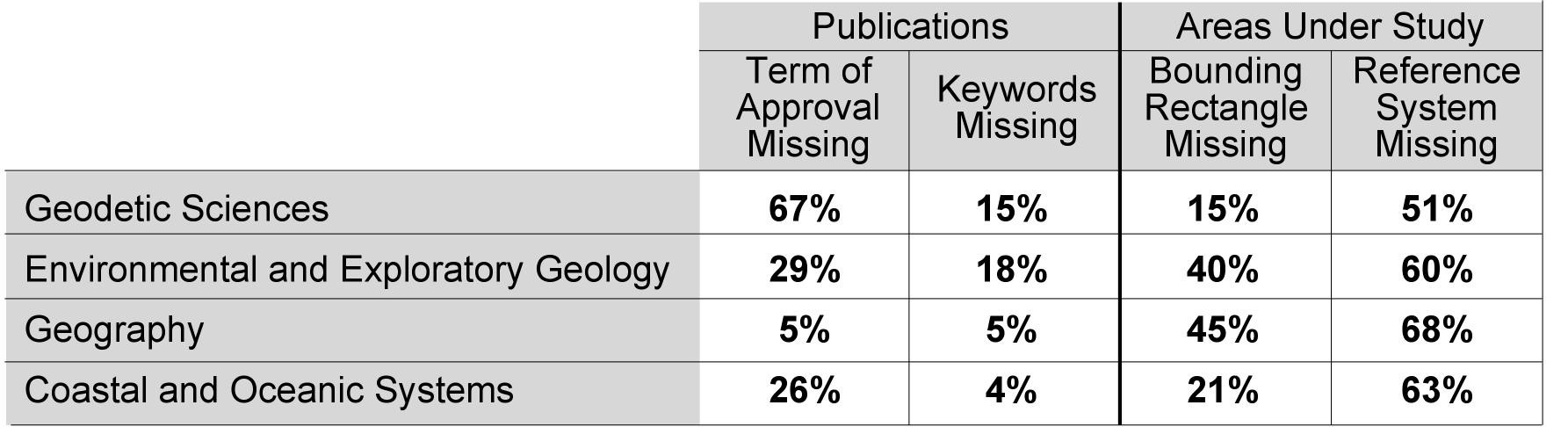The numbers resulting from the survey of the metadata of the areas of study and publications are shown in Figure 5, which describes the missing metadata for the two classes of metadata.