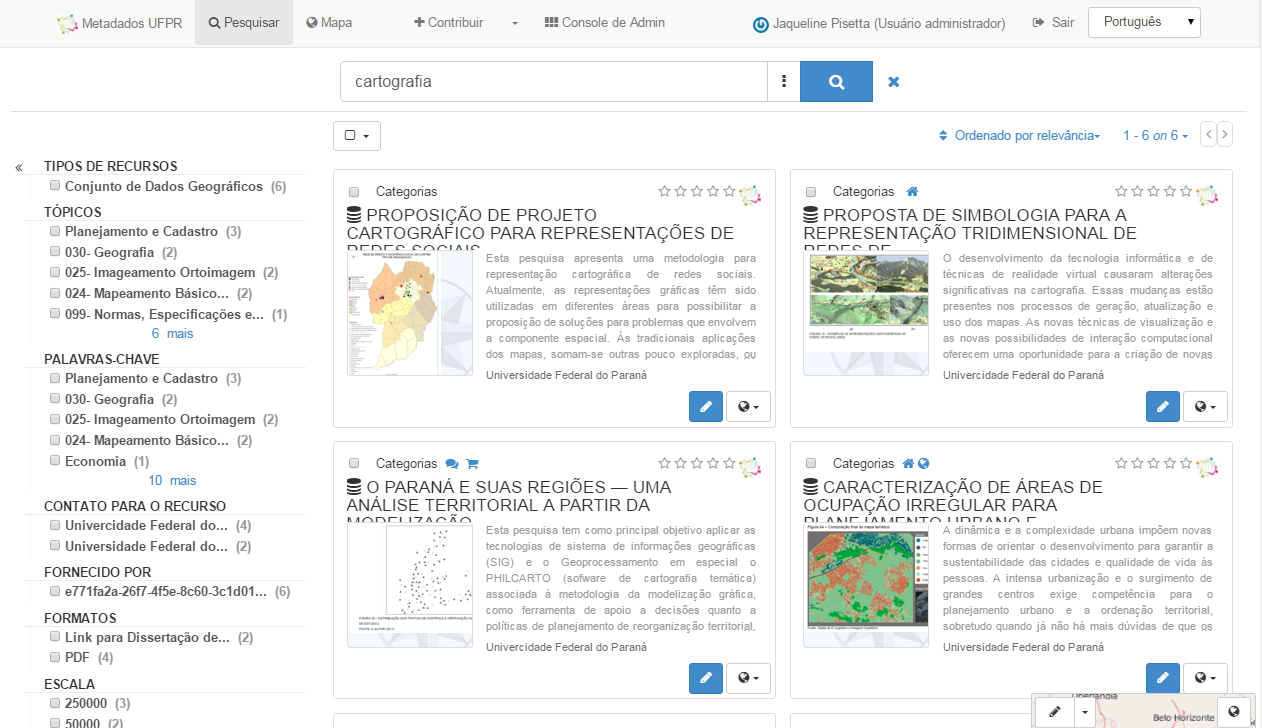 The registration of the metadata of the publications and their respective areas of study resulted in their cataloging through the geoportal in the GeoNetwork environment.