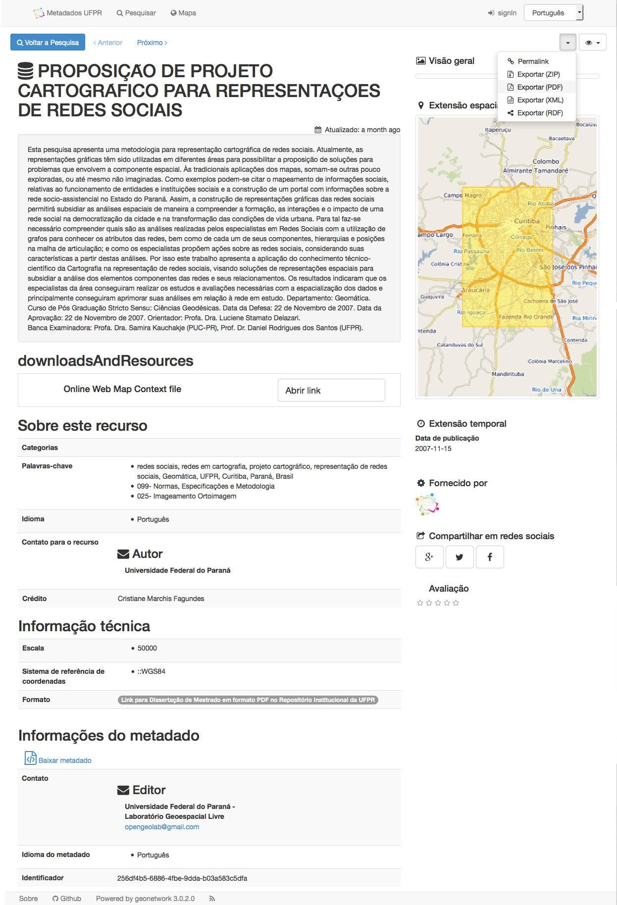 By clicking on the publication of choice, the system generates a window showing metadata about the specific text (Figure 3). In the field Format, on the technical information area, there is a link that redirects the user to the UFPR Institutional Digital Repository, where one can download the thesis or dissertation (pdf document) regarding the metadata described. The user can also save a file that features the metadata for the selected publication, automatically generated by GeoNetwork (Figure 7).