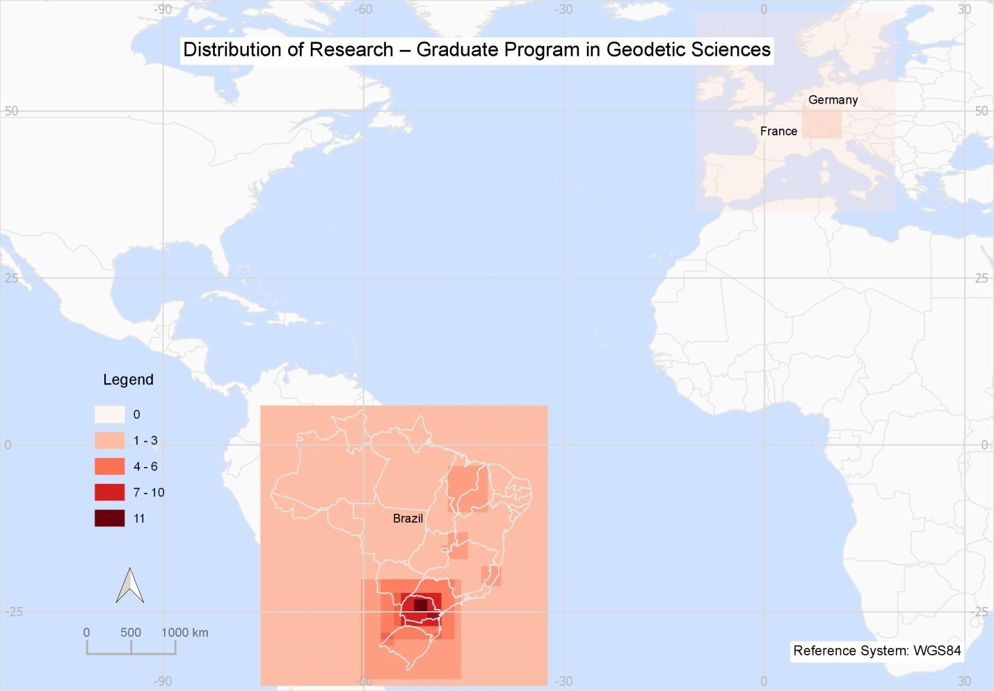 In addition to enabling access to data, the catalog allows users to observe other aspects and characteristics of research at UFPR, which can generate various analyses that are not part of the scope of this research, but can exemplify the importance of the existence of metadata. This is the case of spatial distribution of all registered research in Paraná, in Brazil and/or in the world. Figure 8 considers an example of this distribution for the graduate program in Geodetic Sciences globally. It demonstrates that research generated with geospatial data developed in the Centre-North and East of Paraná abounds. Globally, there is some research in Europe.