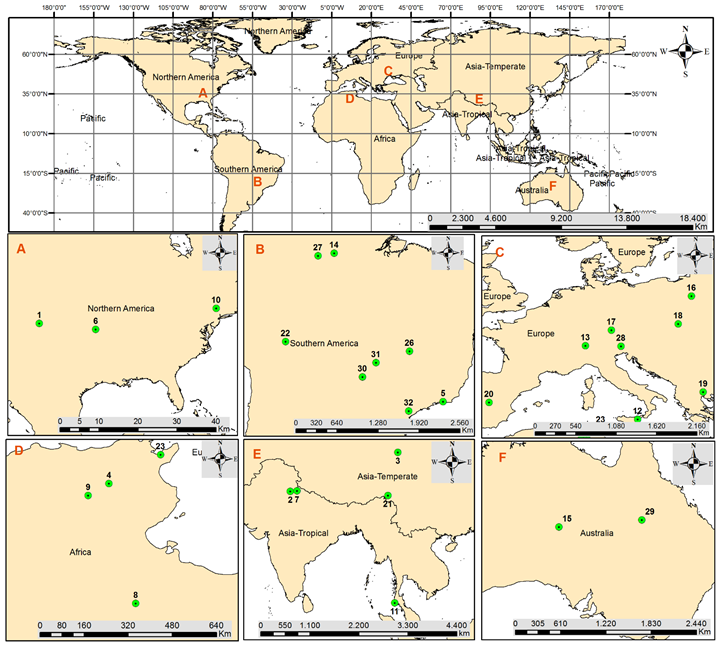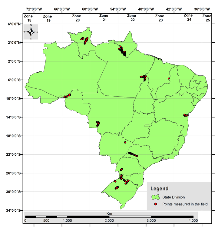 The Brazilian territory was divided into intervals of four-degree latitudes to obtain a homogeneous distribution of the field data and to minimize the occurrence of vast areas without data, making it similar to the division achieved in the Brazilian systematic mapping at 1:1,000,000 scale (IBGE 2016). The selection included the maximum UTM zones that cover the Brazilian territory: 20, 21, 22, 23 and 24 (Figure 2). The selected regions sought to include different levels of altitudes. The highest measured point was in the height of 829.09 meters and the lowest at the elevation of 0.74 meters.