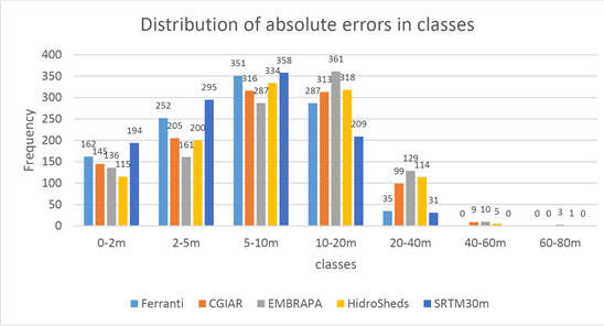 Predictably, the 30-meter resolution model showed higher accuracy than the 90-meter resolution models. However, although the resolution is three times better, the accuracy is approximately 10% higher. For example, the RMSE of Jonathan de Ferranti’s model for all Brazil is of 9.61m, while for the SRTM-GL1 is of 8.52m. The obtained RMSE result for SRTM GL1 was compatible with that found for the South American Andean Plateau (RMSE = 9.7) (Satge et al. 2016).
