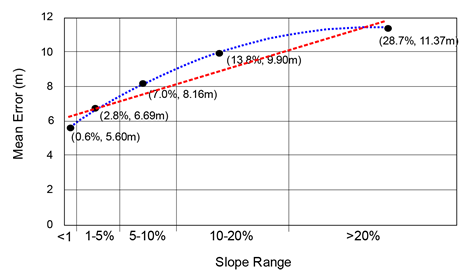 In the slope analyzes, we used only the 90-meter resolution model with the best accuracy (Jonathan de Ferranti’s SRTM). The absolute values of the average error varied linearly with the mean slope within each slope range, obtaining a significant coefficient of determination (R2) of 0,907 (Figure 4). Complementarily, the second-order polynomial function obtains an extremely accurate adjustment of the data, achieving an R2 of 0.999. The average magnitude of errors in slope terrains (>20%) is approximately twice higher than flat terrain (<1%). The regression obtained serves as a basis to estimate the expected errors in the different types of relief. The results were consistent with other surveys, which demonstrated that the highest errors occur preferentially in mountainous regions than in flat areas (Sun et al. 2003; Gorokhovich and Voustianiouk 2006; Rexer and Hirt 2014).