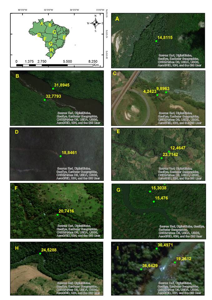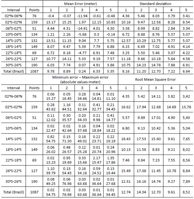 The data used were obtained from the Documentation Center of the Brazilian Electricity Regulatory Agency (ANEEL), where the projects of hydroelectric plants or hydroelectric inventories approved are archived (ANEEL 2009). The measured points in the field came from GNSS (Global Navigation Satellite System) trackers to support photogrammetric restitutions or topographic survey. The data selection considered zones with 4 degrees of latitude for Brazil. The field points were converted to a single reference system, SIRGAS2000. The SRTM evaluation adopted at least 50 field points for each latitude zone.