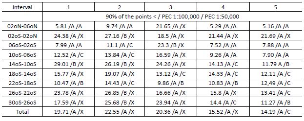 The PEC classification considered two types of analysis: one local (Latitude bands) and another general (all Brazil) (Table 4). The models at a scale of 1:100,000 showed a PEC classification of “A” predominantly in the local analysis (with few exceptions acquiring “B”) and obtained “A” class in general analysis. The 1: 50,000 scale models had different classifications in the local analysis (“A”, “B”, or “C”) and were not classifiable considering general approach (Table 4). The Jonathan de Ferranti’s model presents considerably better results for models with 90m, with smaller errors for 90% of the points and standard deviation (Table 4).